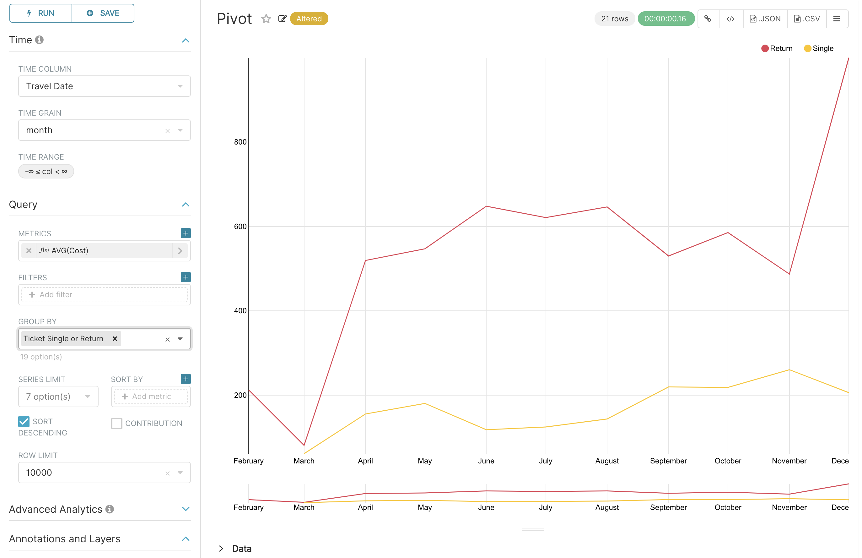 Let’s do this by selecting Ticket Single or Return in the Group by box, and the selecting Run Query again. Nice! We can see that on average single tickets are cheaper than returns and that the big spike in December is caused by return tickets.