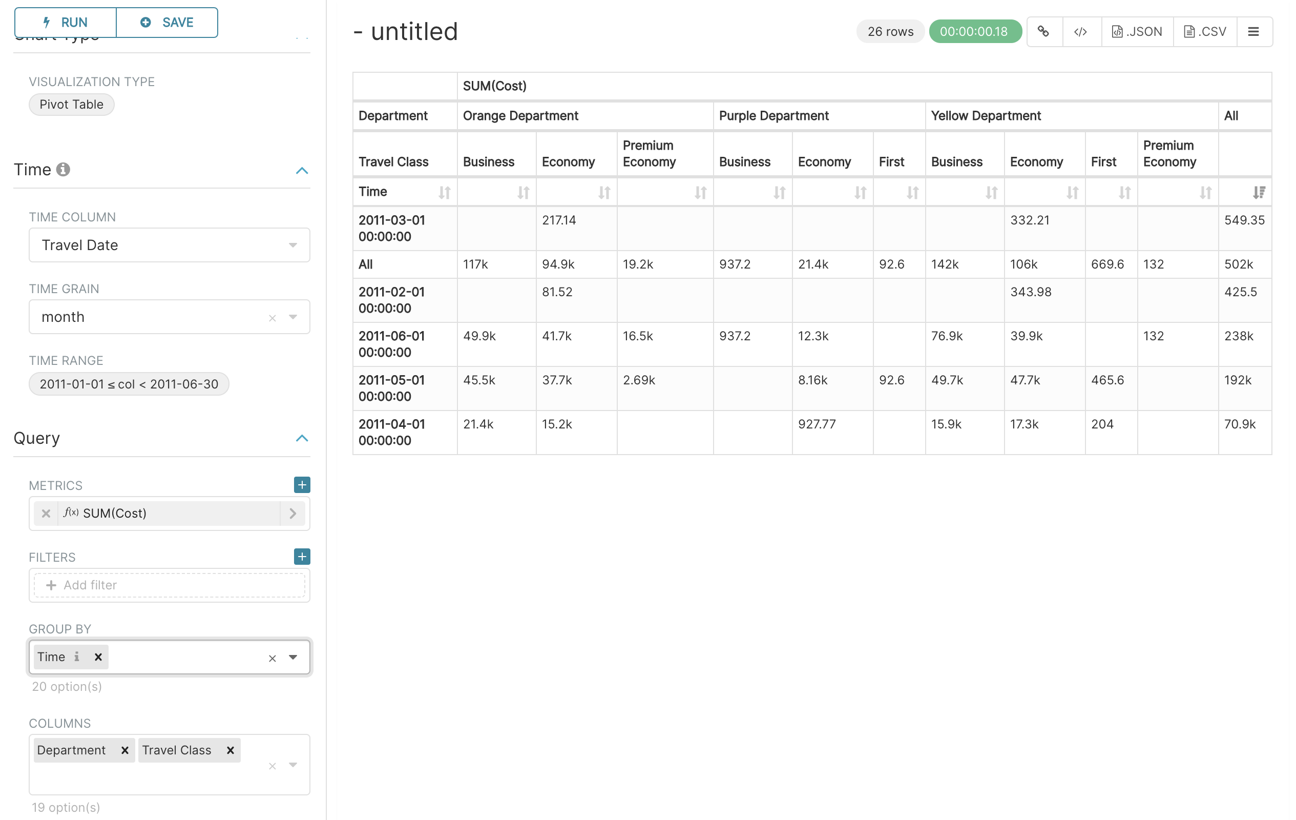 Within Columns, first select Department and then Travel Class. All set – let’s Run Query to see some data!